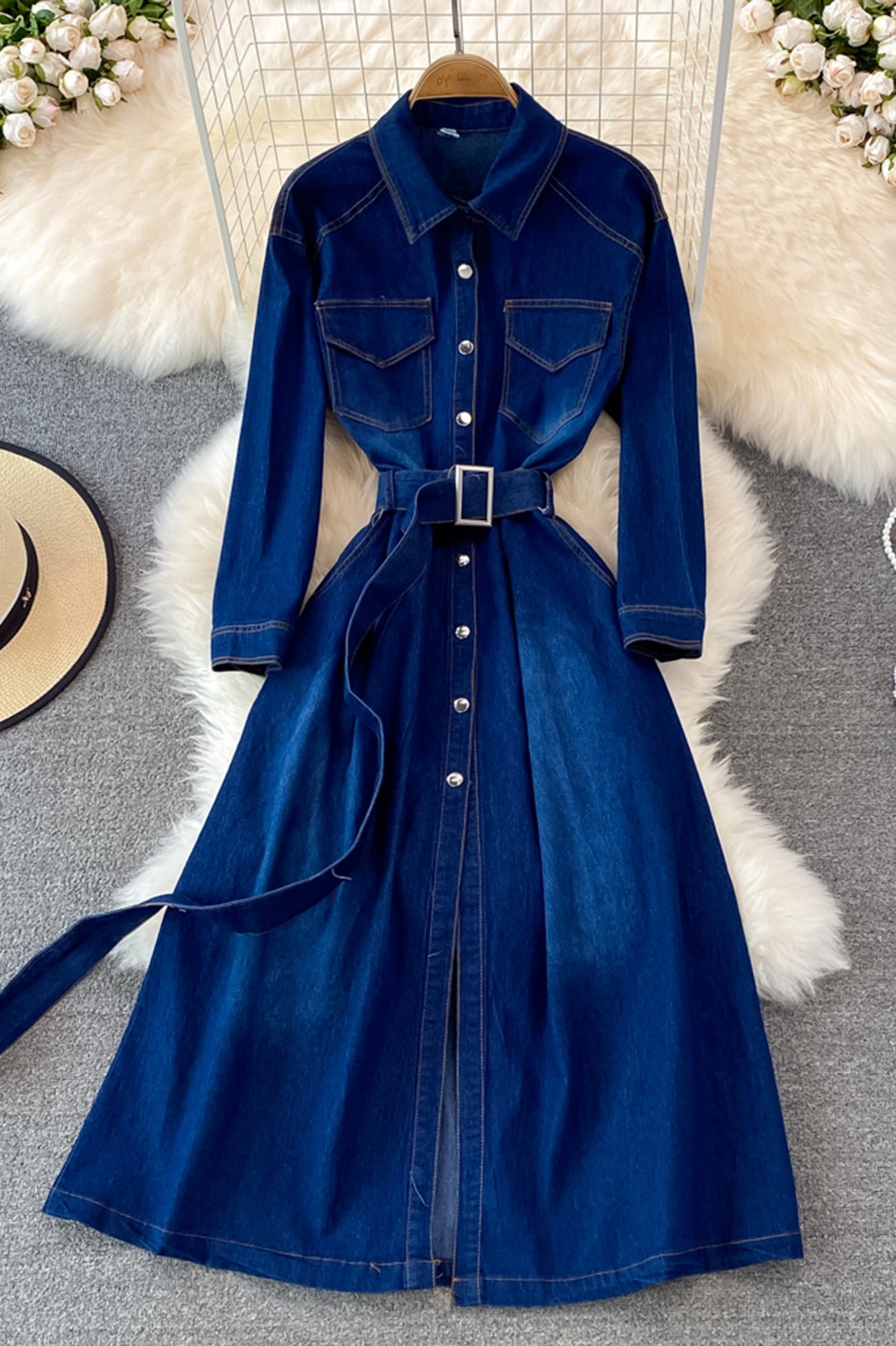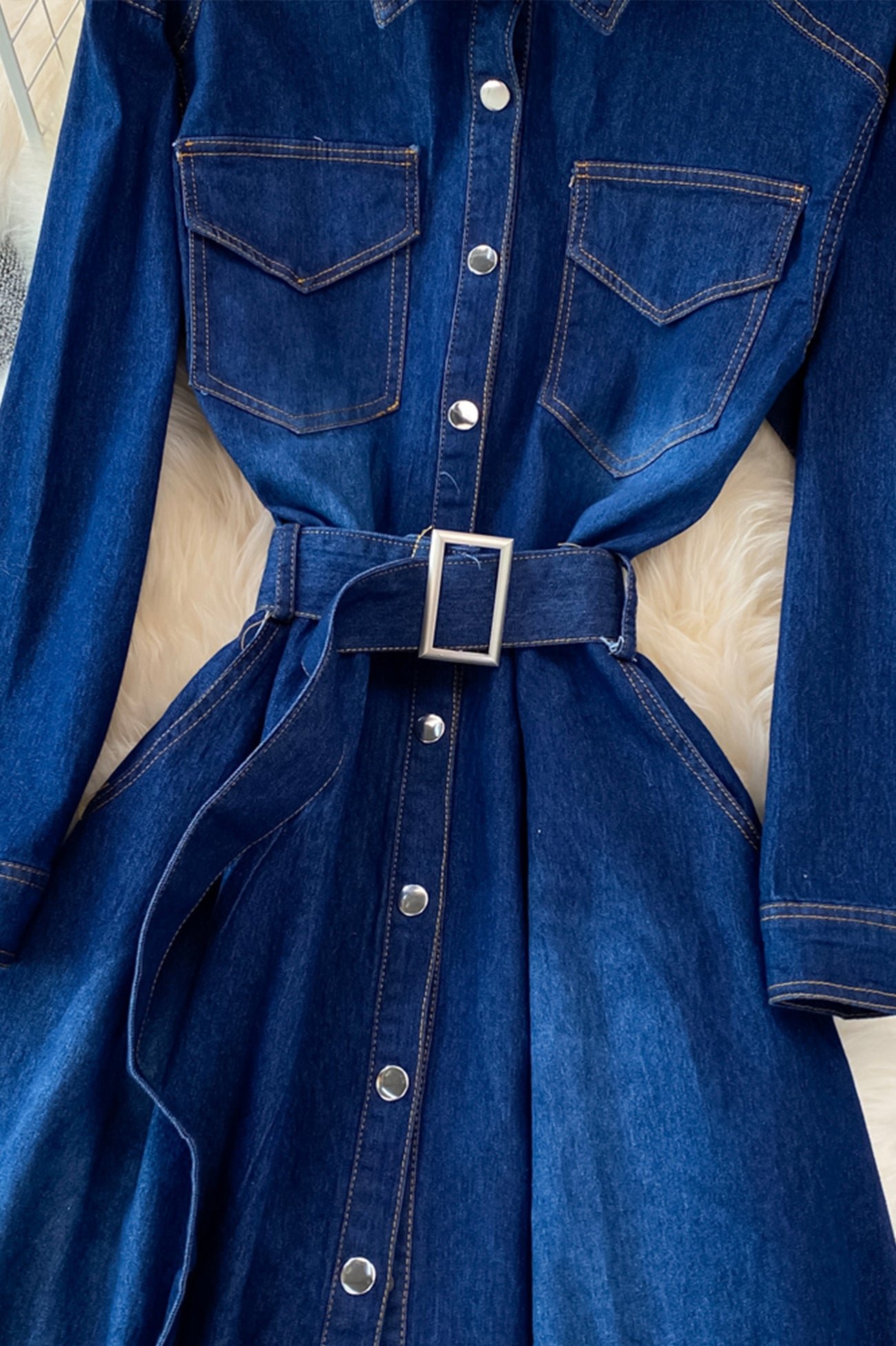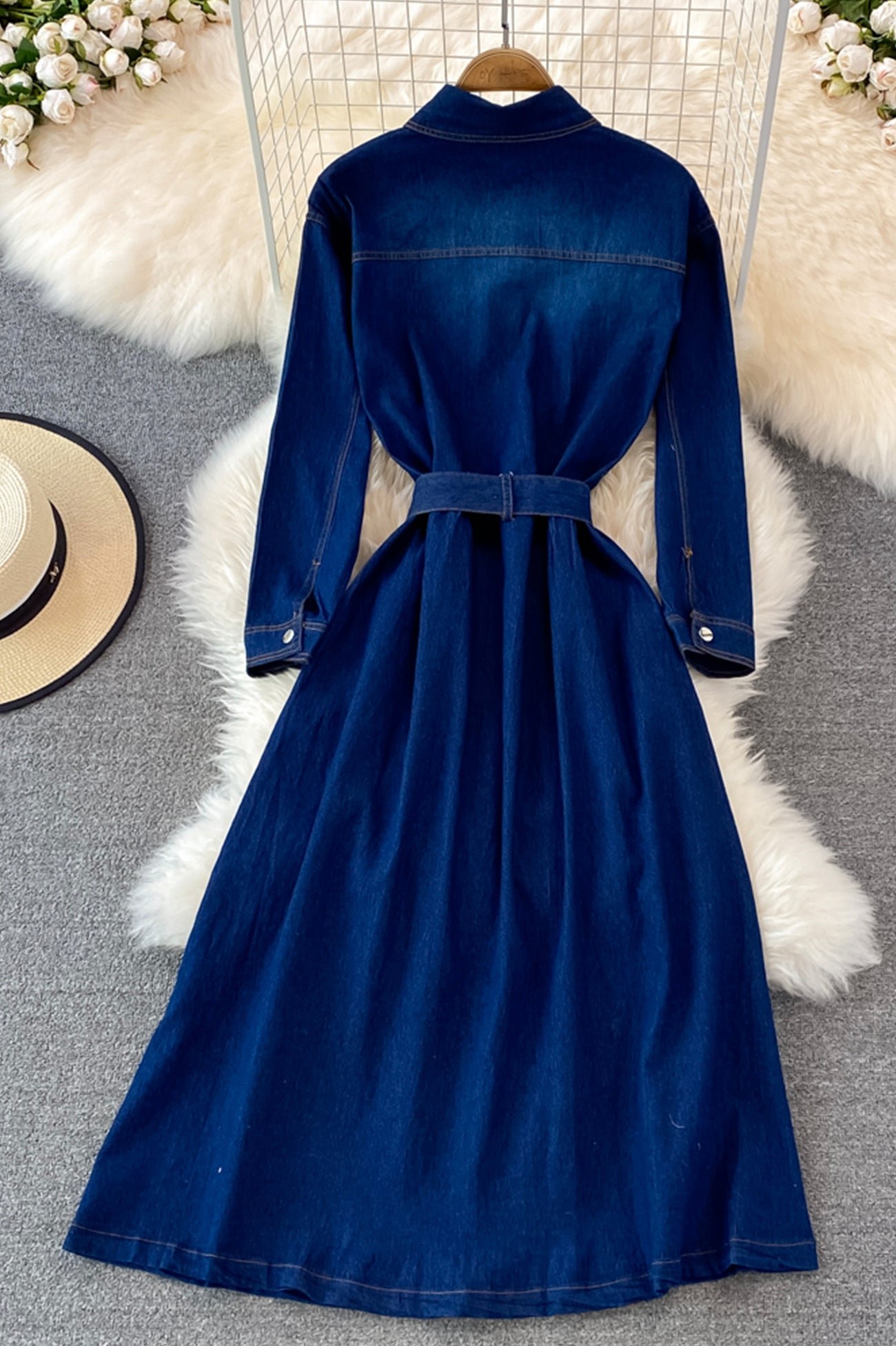 Blue A-line Long Sleeve Denim Dress
